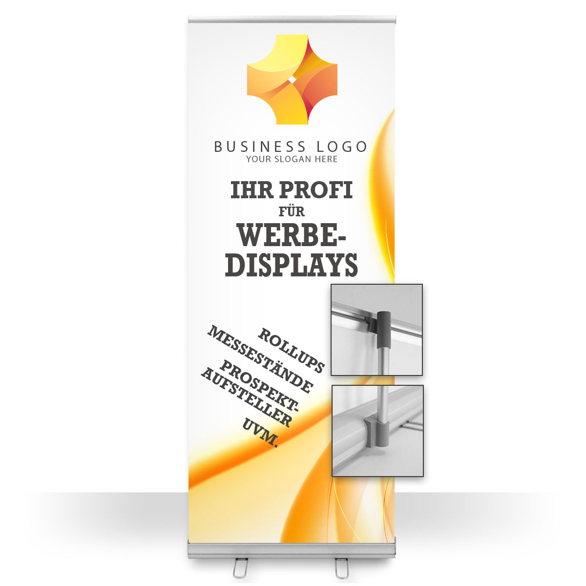 • Qualitativ gutes Rollup mit verchromten Standfüßen